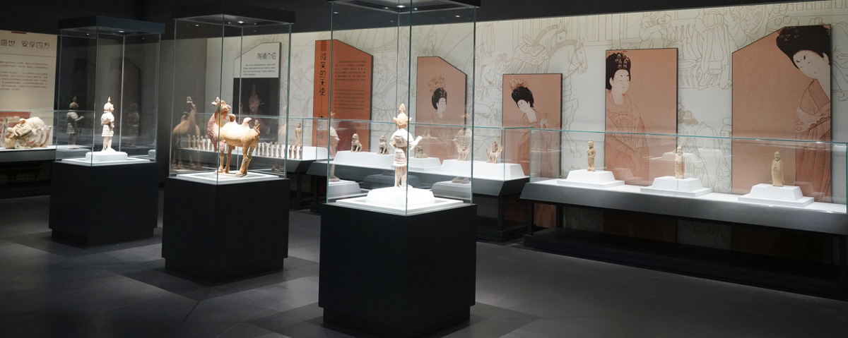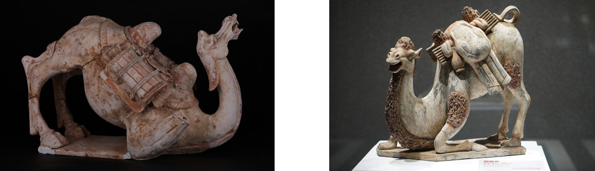 骆驼也是唐俑中的重要主题之一。当年来往于丝绸之路的骆驼商队由长安起程,源源不断地将丝绸运往印度、波斯和罗马。昂首扬颈、步伐矫健的骆驼,伴随着驼铃声声,展现出一幅丝路花雨、文化交融的历史风情画。