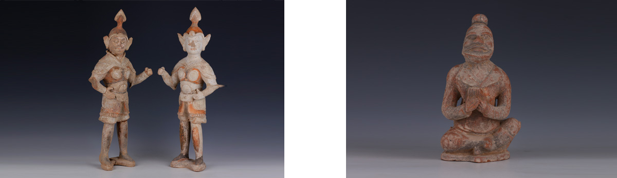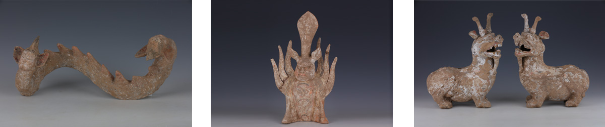 镇墓兽源于古代传说中的方相氏,据说有驱邪除恶、守护亡灵的法力,是生者为保护死者在天国免遭鬼怪侵害和邪恶侵入的镇妖辟邪之物。镇墓兽一般放置在墓室的前部,一对两件迎门列布,其后才是武士俑或天王俑。